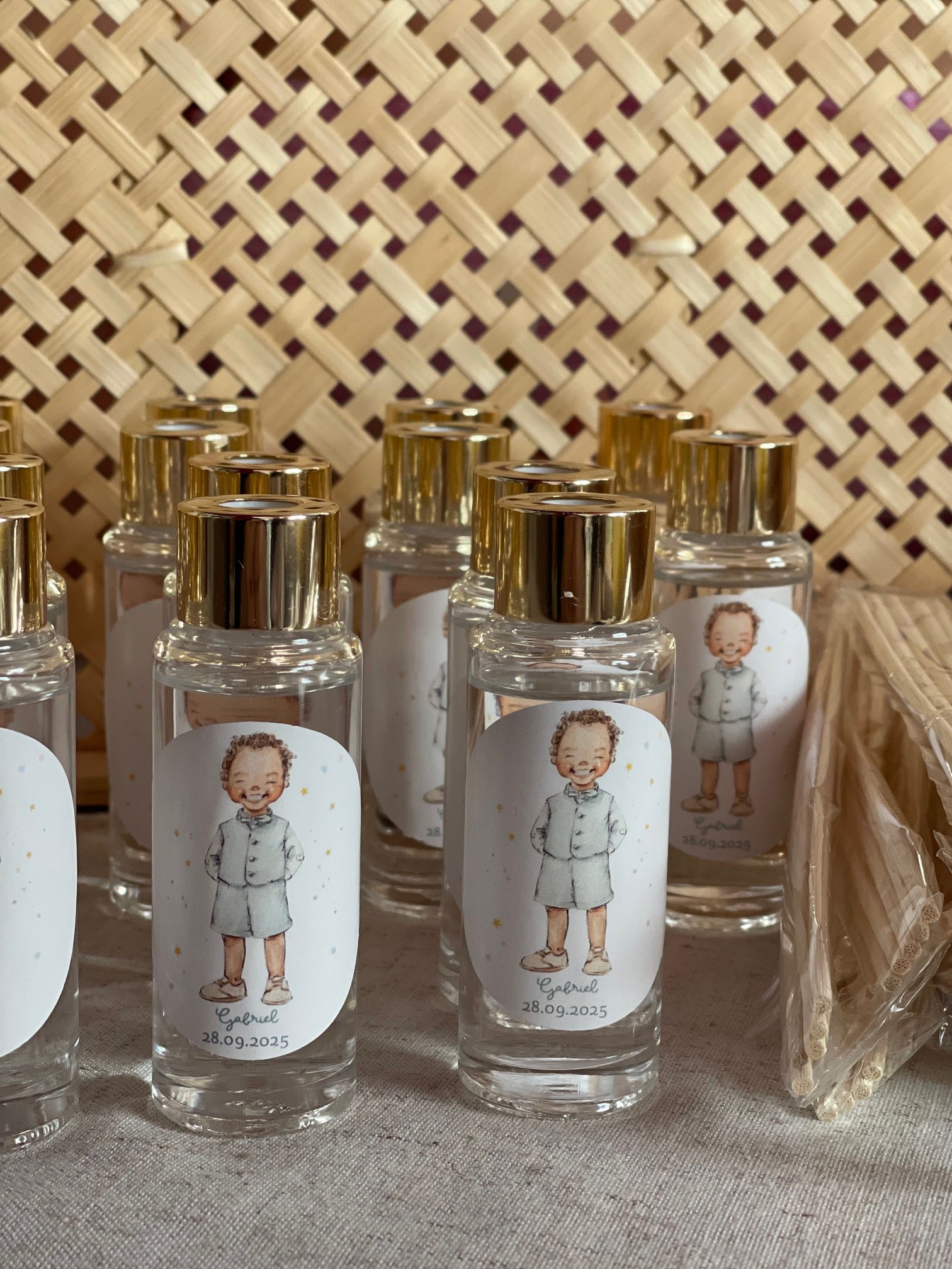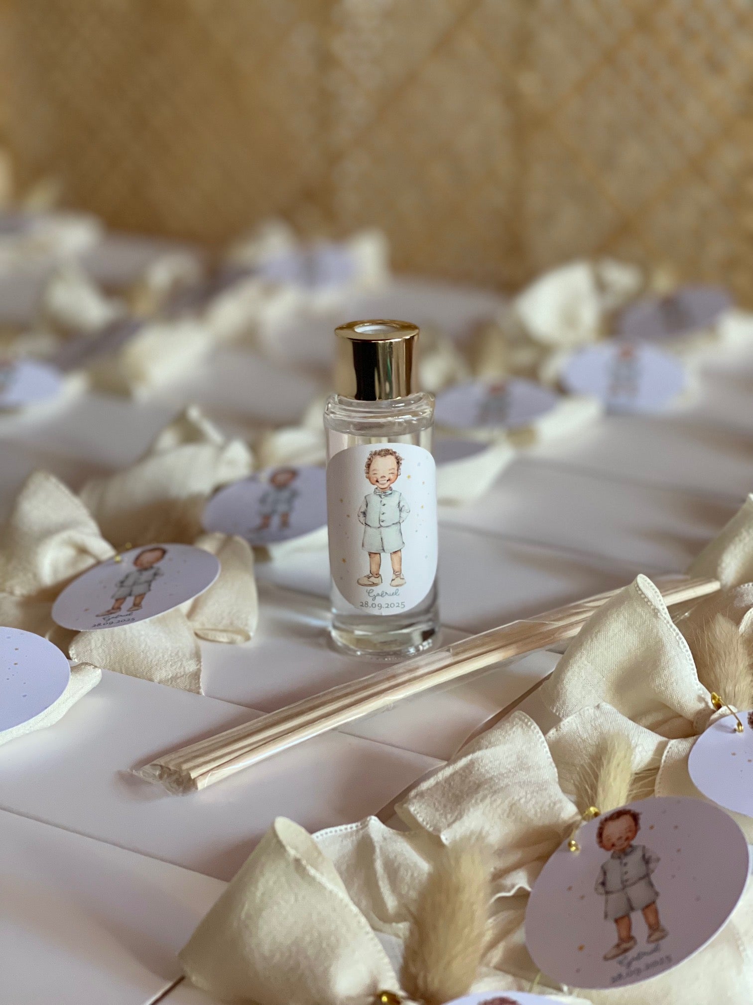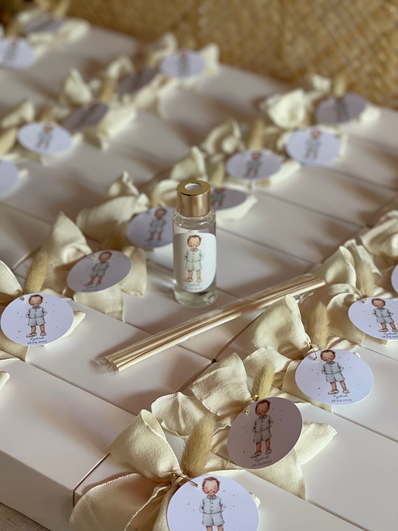 Etiqueta personalizada, com possibilidade de utilização do logótipo que já possui (por exemplo, o mesmo utilizado no convite). Após a realização da compra, deverá inserir, no campo de notas, as informações que pretende incluir ou, em alternativa, enviar-nos uma mensagem via WhatsApp (+351 914 373 505) com os dados a utilizar na etiqueta. Antes da impressão final, será enviada uma maquete para sua aprovação.