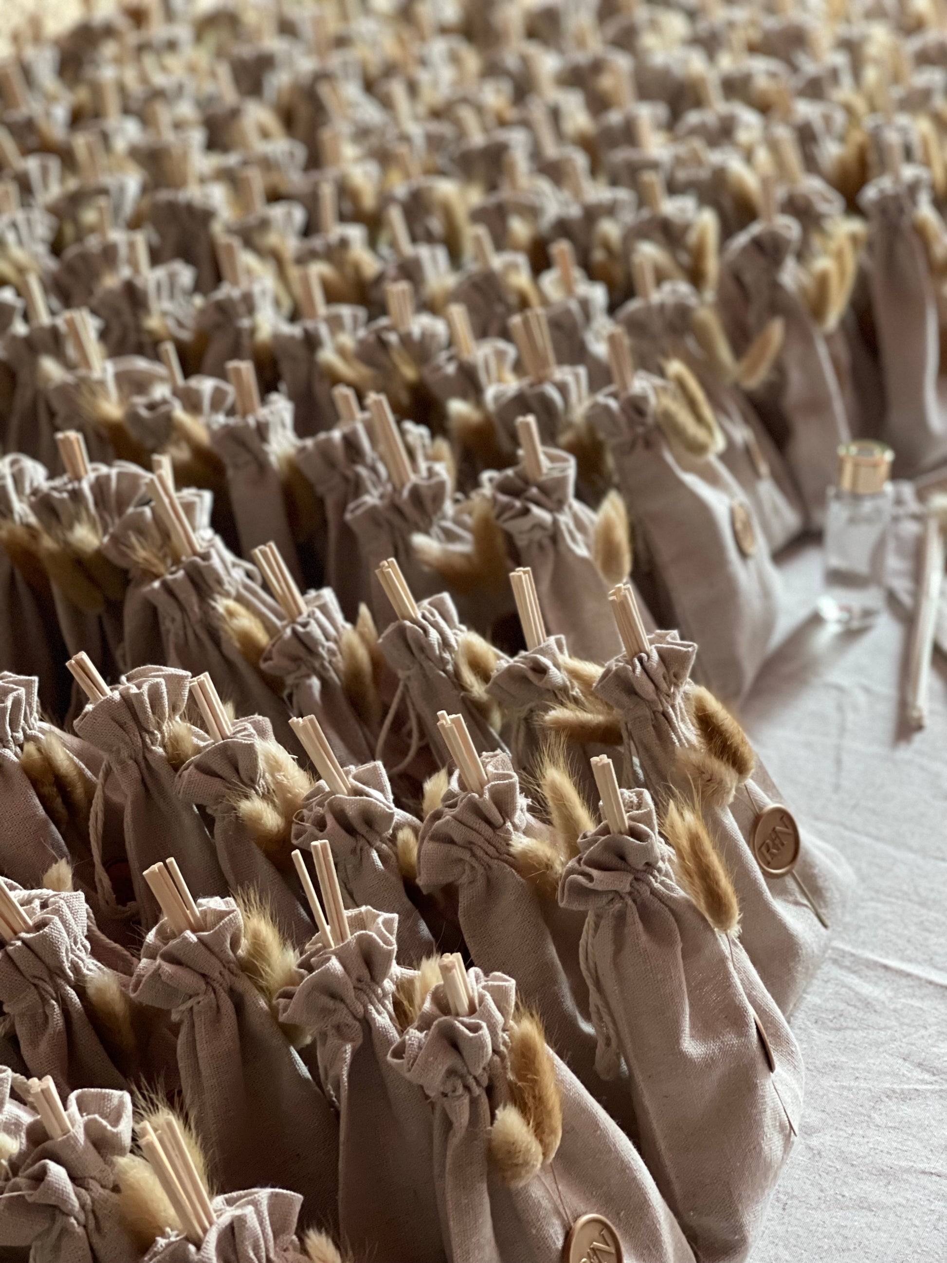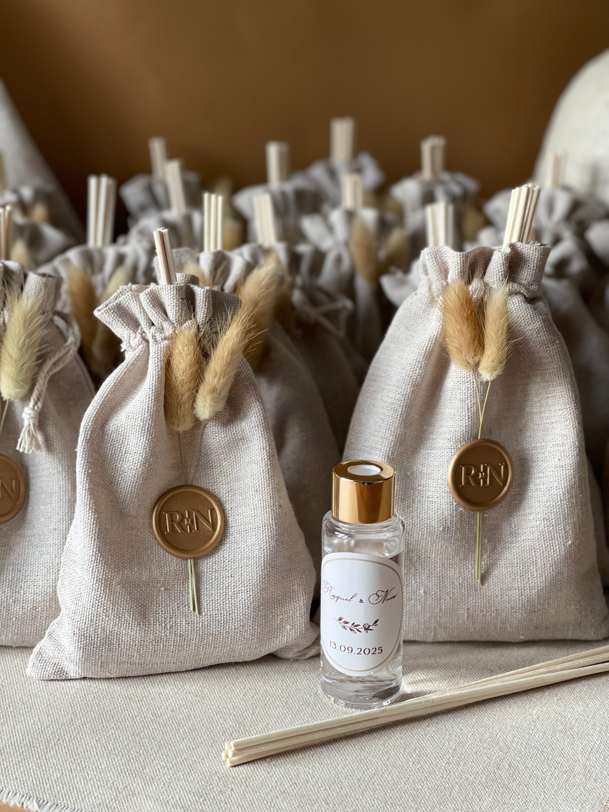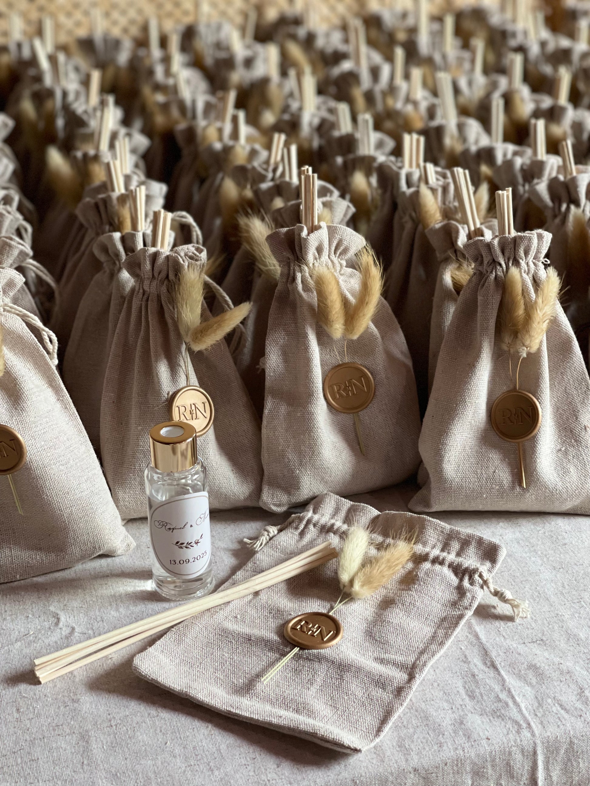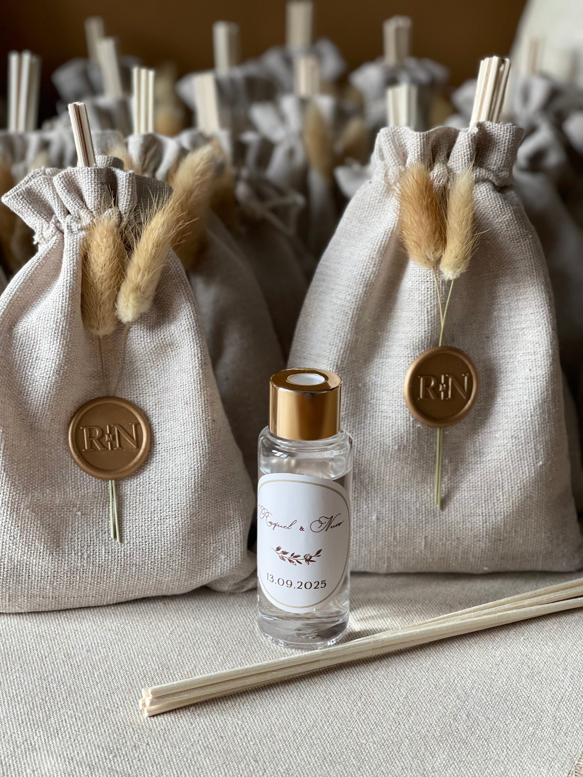 Ambientador para casa, em frasco de vidro transparente e tampa dourada entregue dentro de um saco de algodão personalizado com lacre e flores secas.