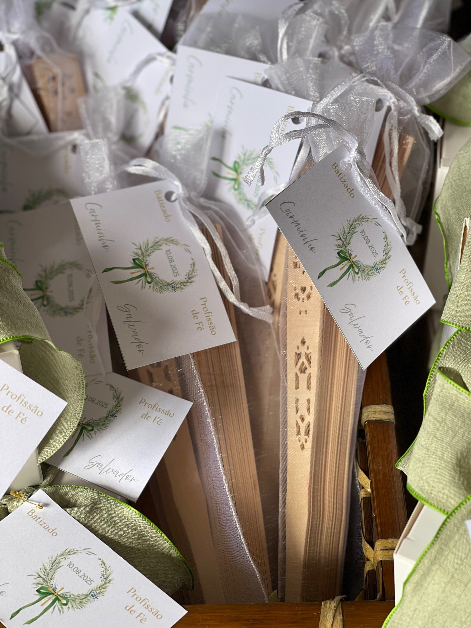 Leques de madeira, com saco branco de organza e etiqueta personalizada.