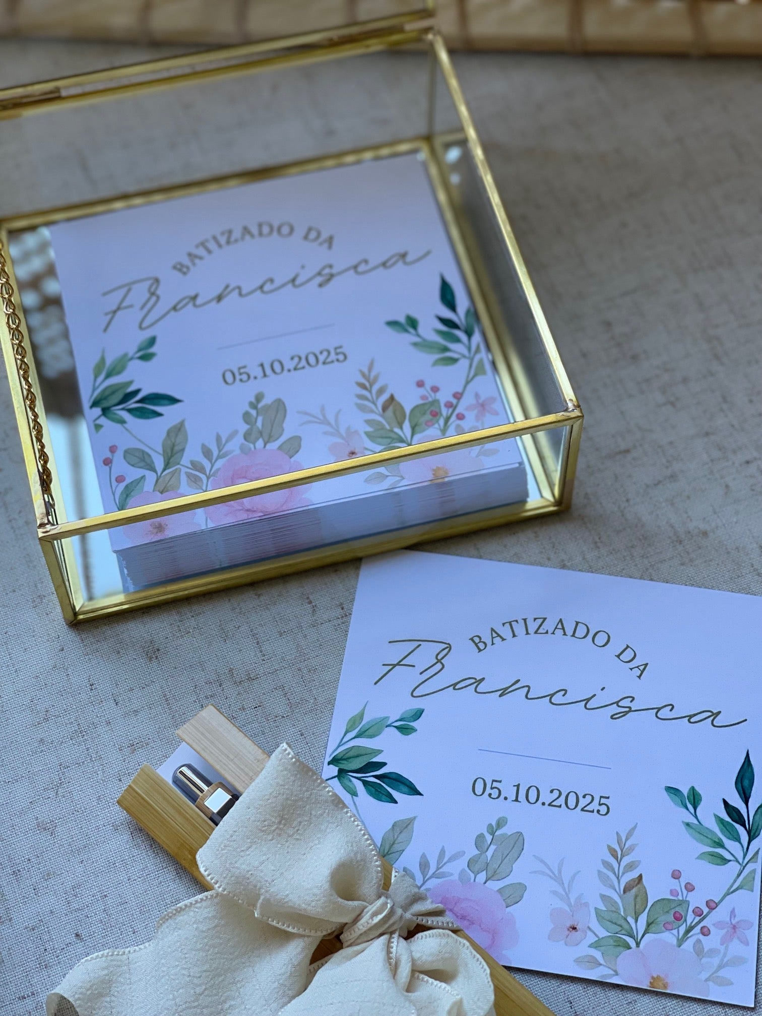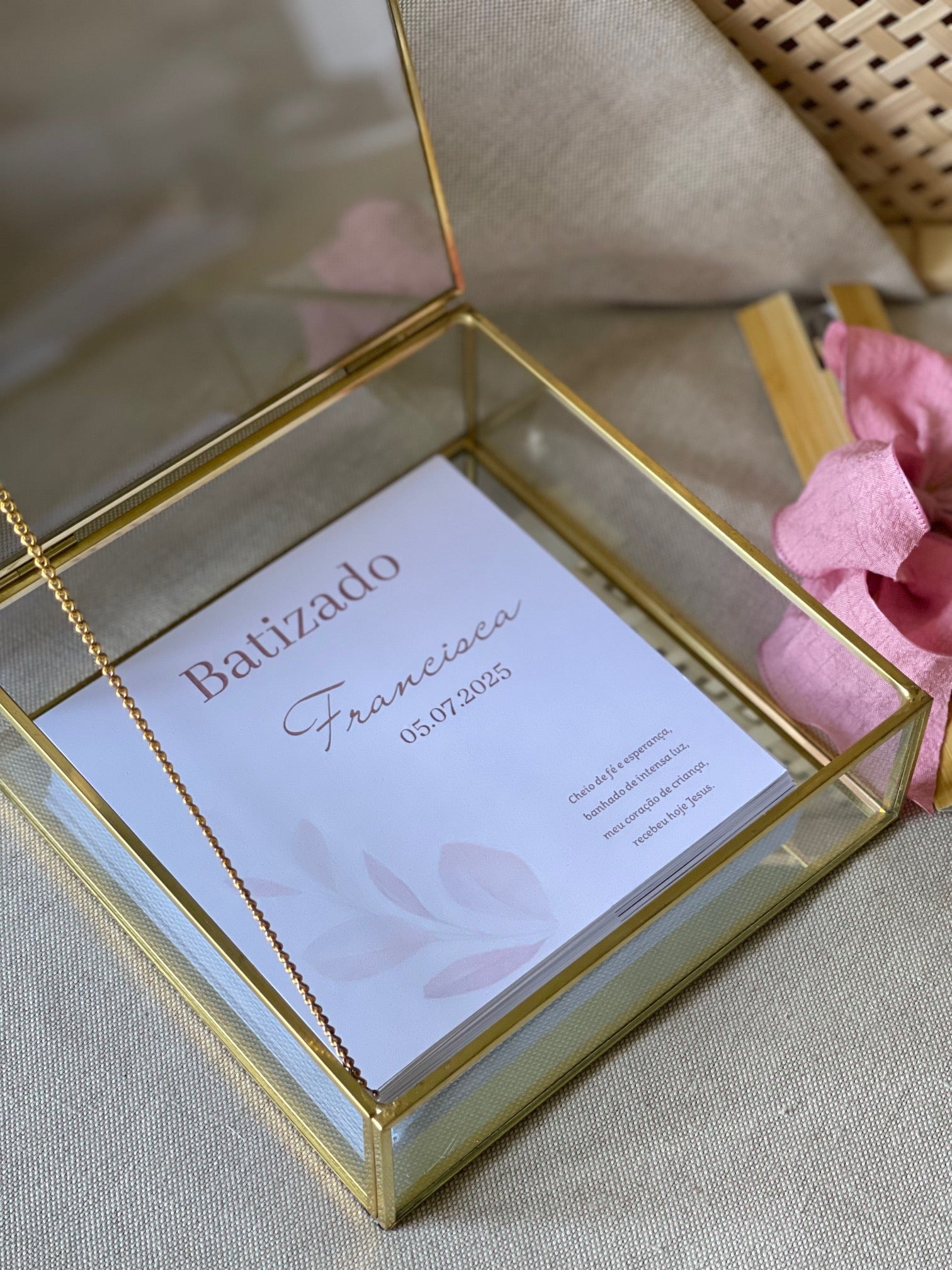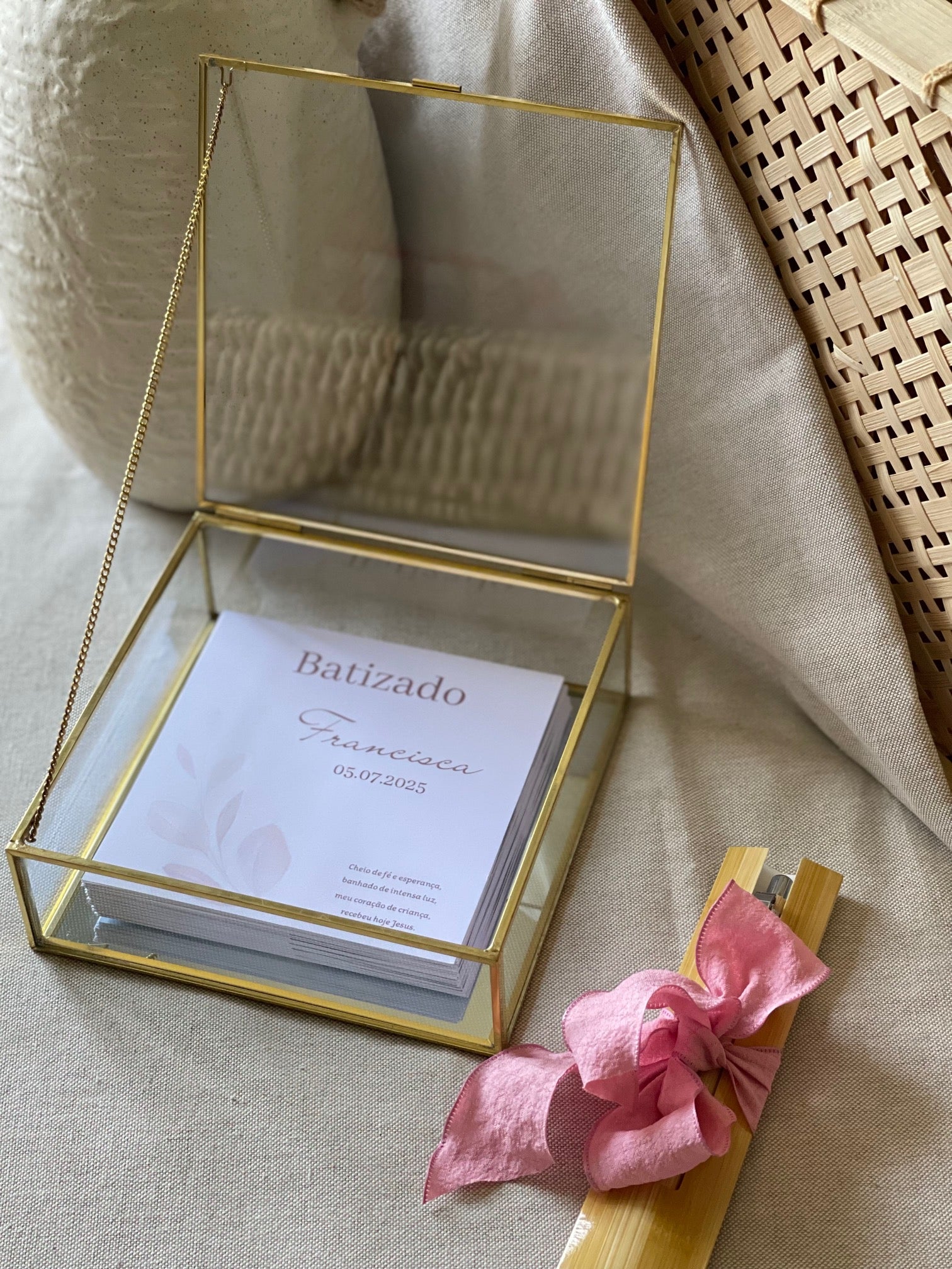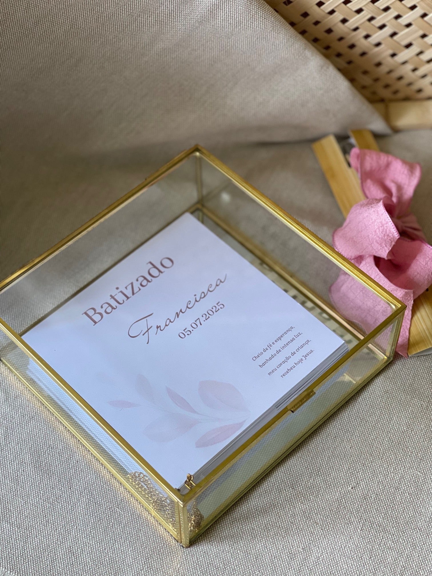 Caixa de vidro com rebordo dourado e cartões personalizados.
