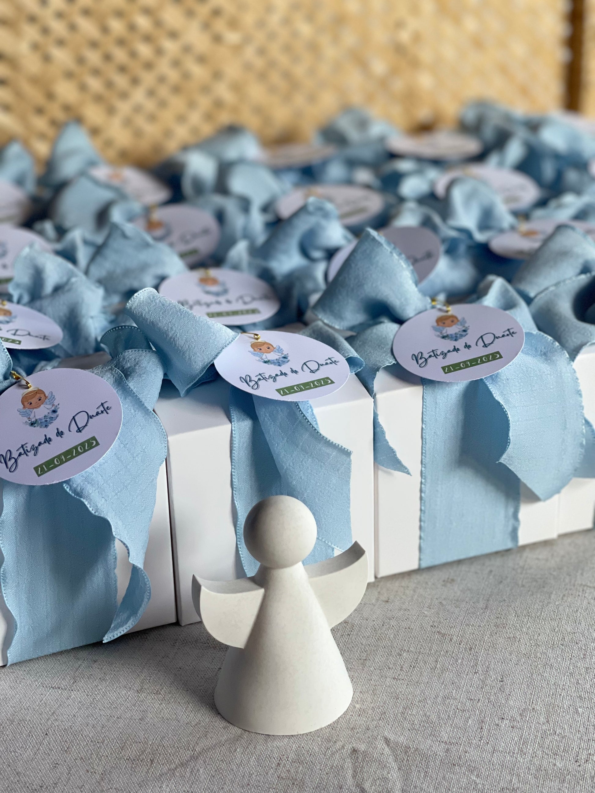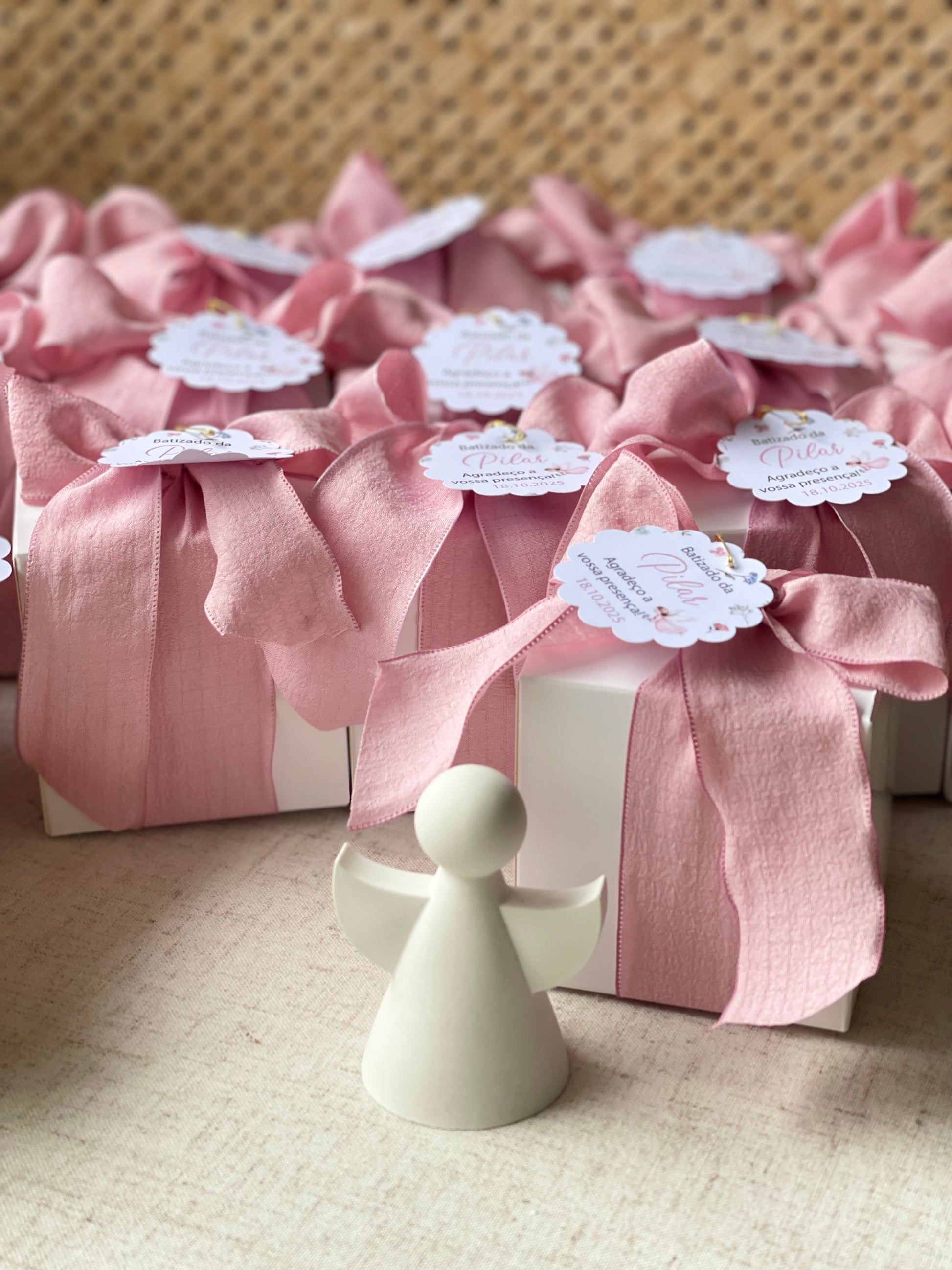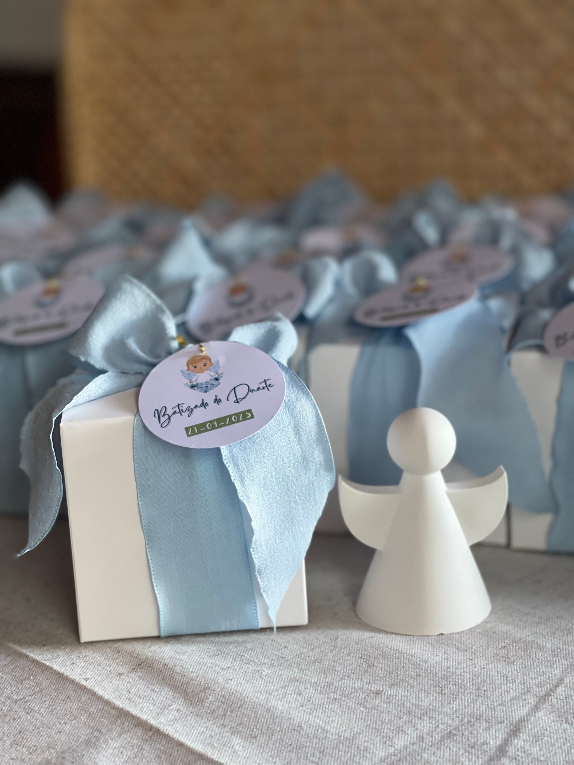 Anjo de gesso perfumado em cor branca, entregue em uma caixa de cartão branco personalizada.
