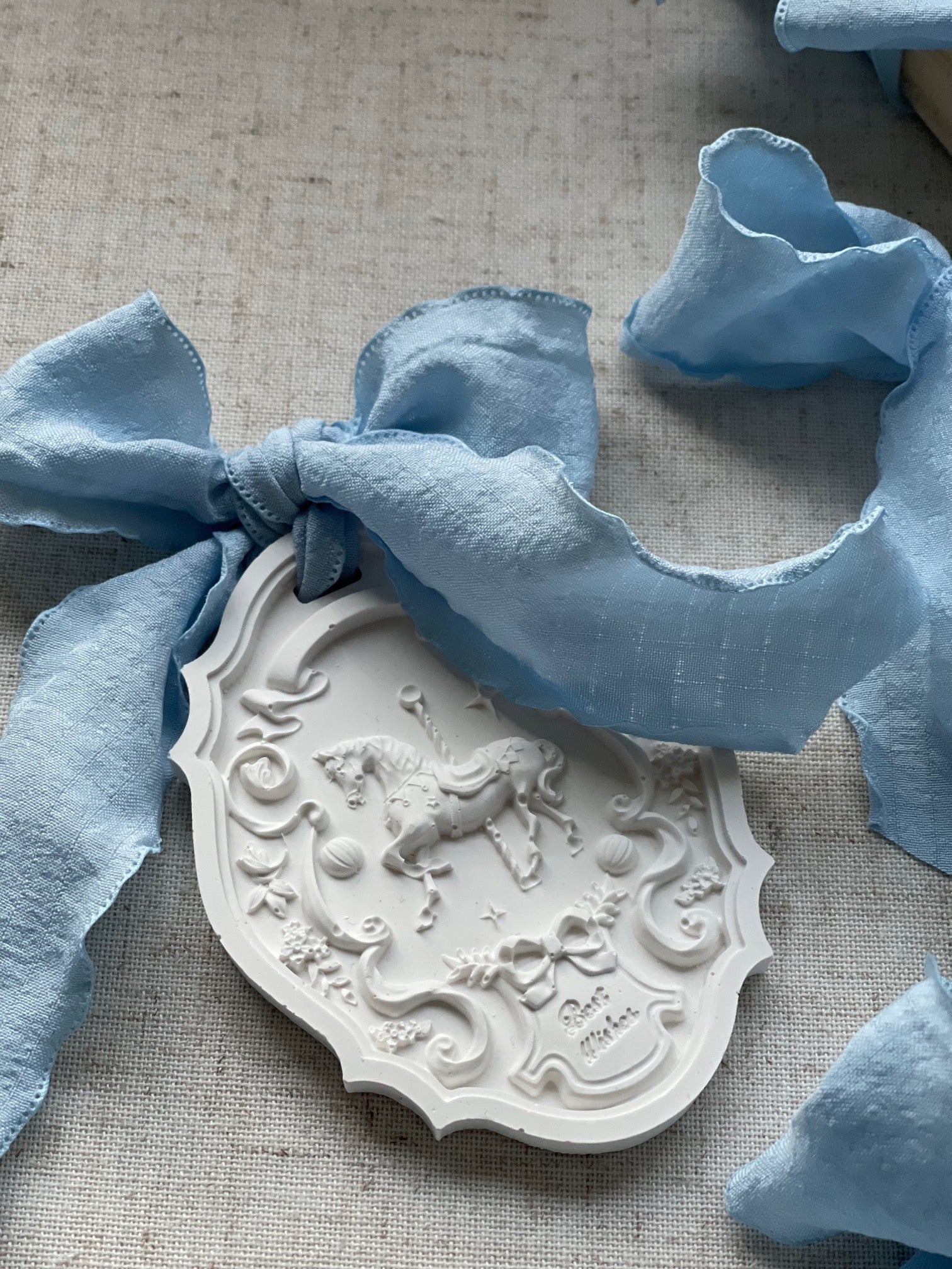 Peça em gesso perfumado, entregue dentro de uma caixa branca, decorada com fita (a fita pode ser rosa, bege, azul ou verde), e etiqueta personalizada.