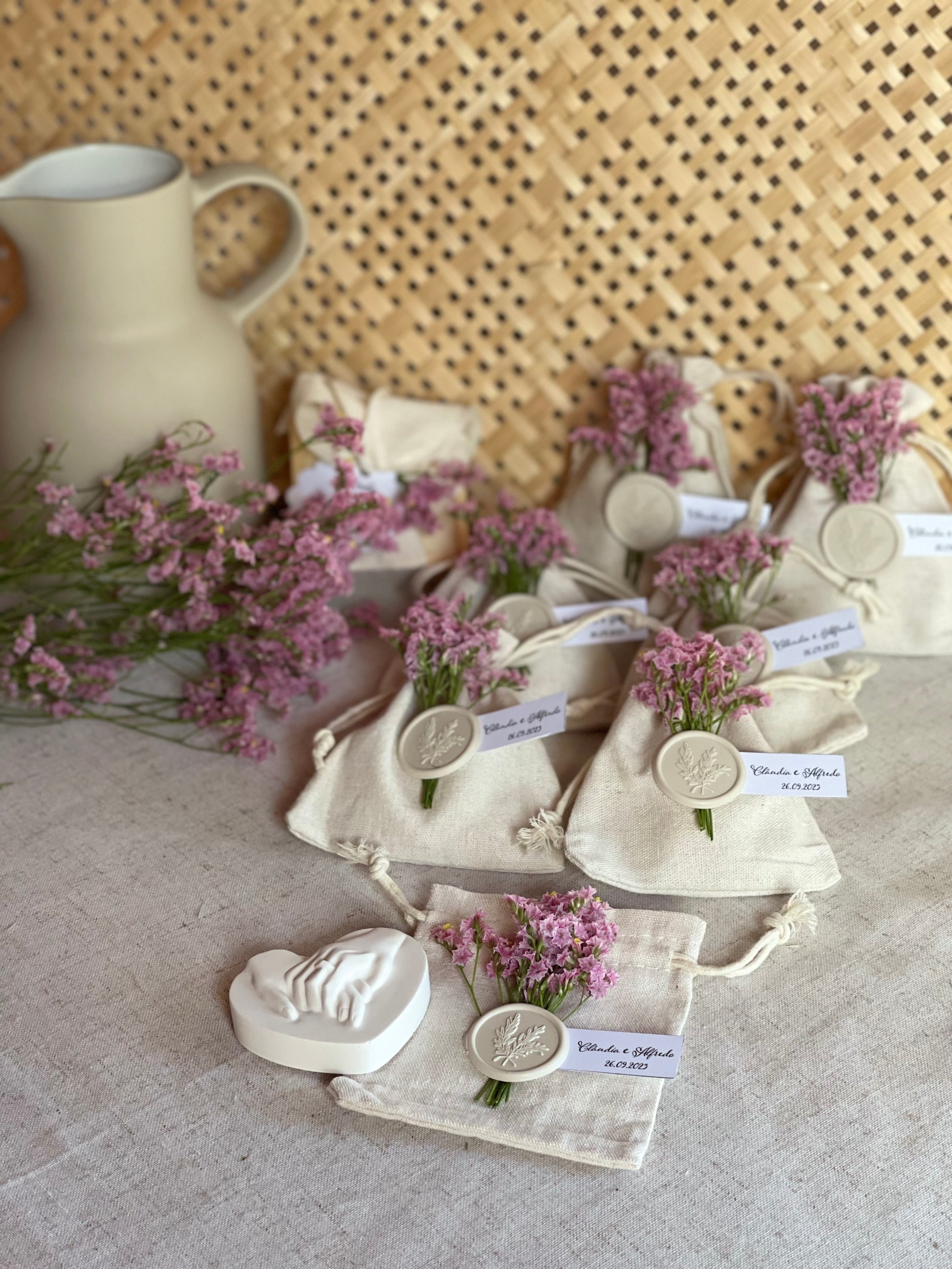 Coração em gesso perfumado, entregues dentro de um saco de algodão e flores secas de limonio rosa e lacre bege.