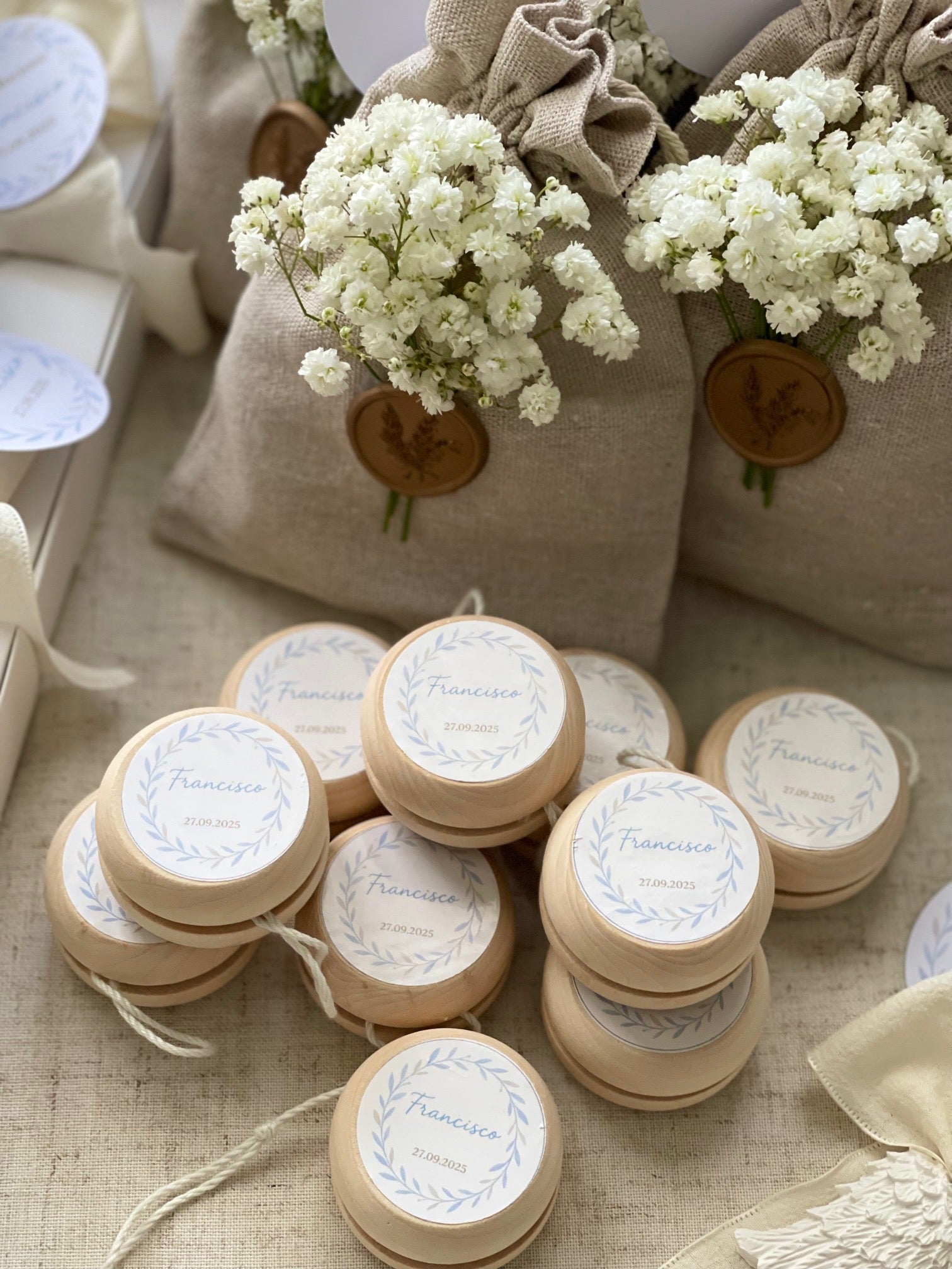 Etiqueta personalizada, podendo ser utilizado o logótipo que já possua (por exemplo, que foi utilizado no convite ). Após realizar a sua compra deve nos enviar por email (encomendas.focoeventos@gmail.com) ou WhatsApp (+351 914373505), as informações que pretende utilizar na etiqueta. Antes da impressão final será enviada a maquete para aprovação.