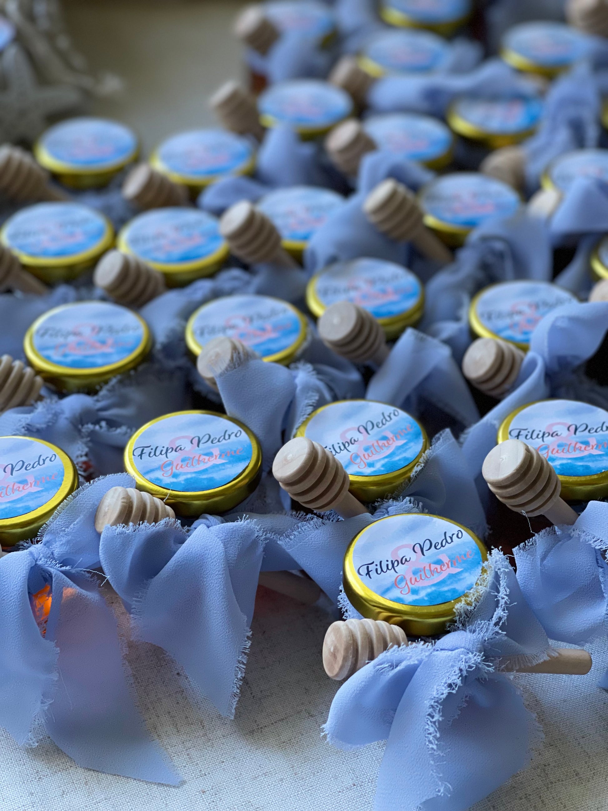 Etiqueta personalizada, podendo ser utilizado o logótipo que já possua (por exemplo, que foi utilizado no convite ). Após realizar a sua compra deve nos enviar por email (encomendas.focoeventos@gmail.com) ou WhatsApp (+351 914373505), as informações que pretende utilizar na etiqueta. Antes da impressão final será enviada a maquete para aprovação.