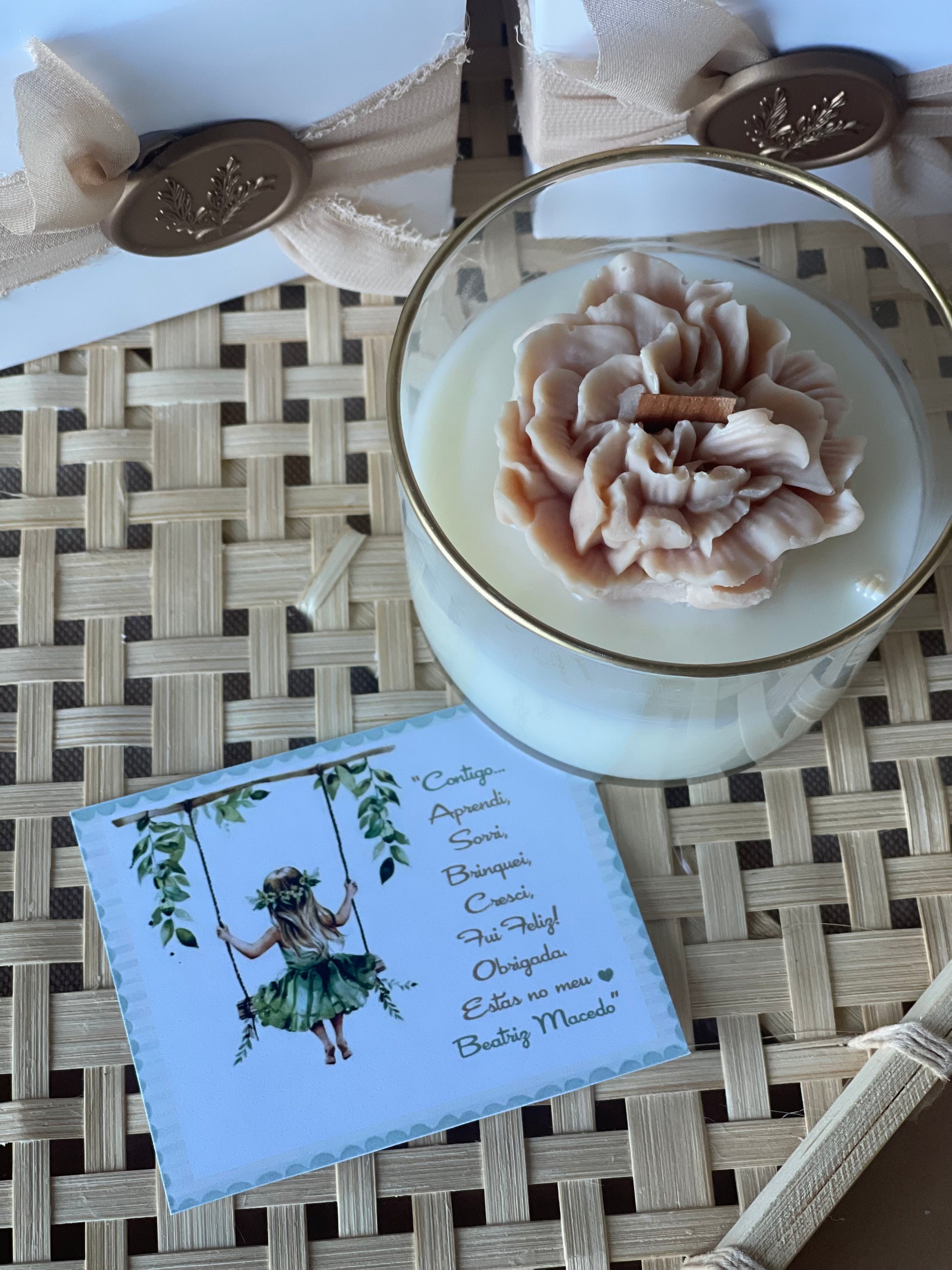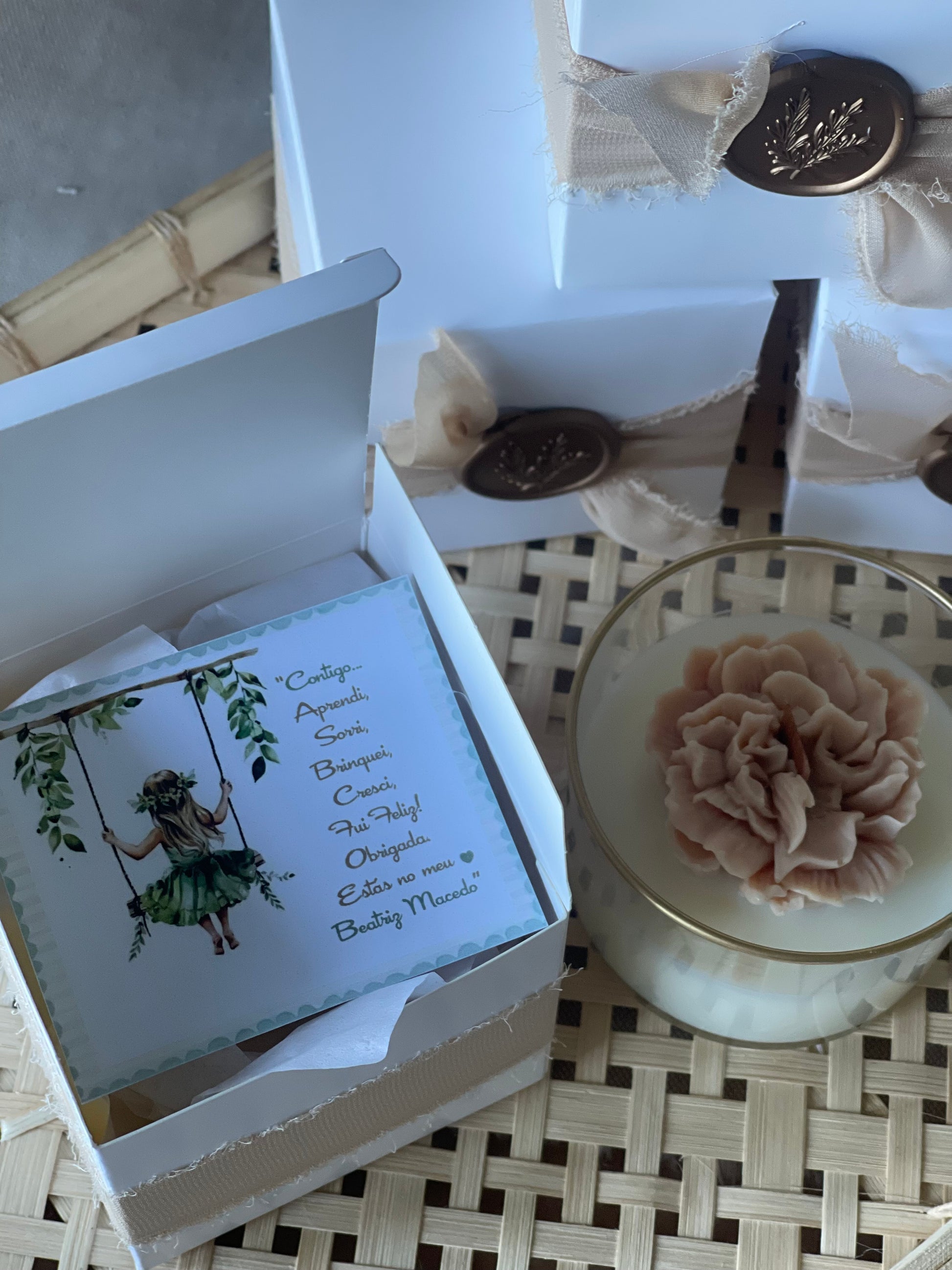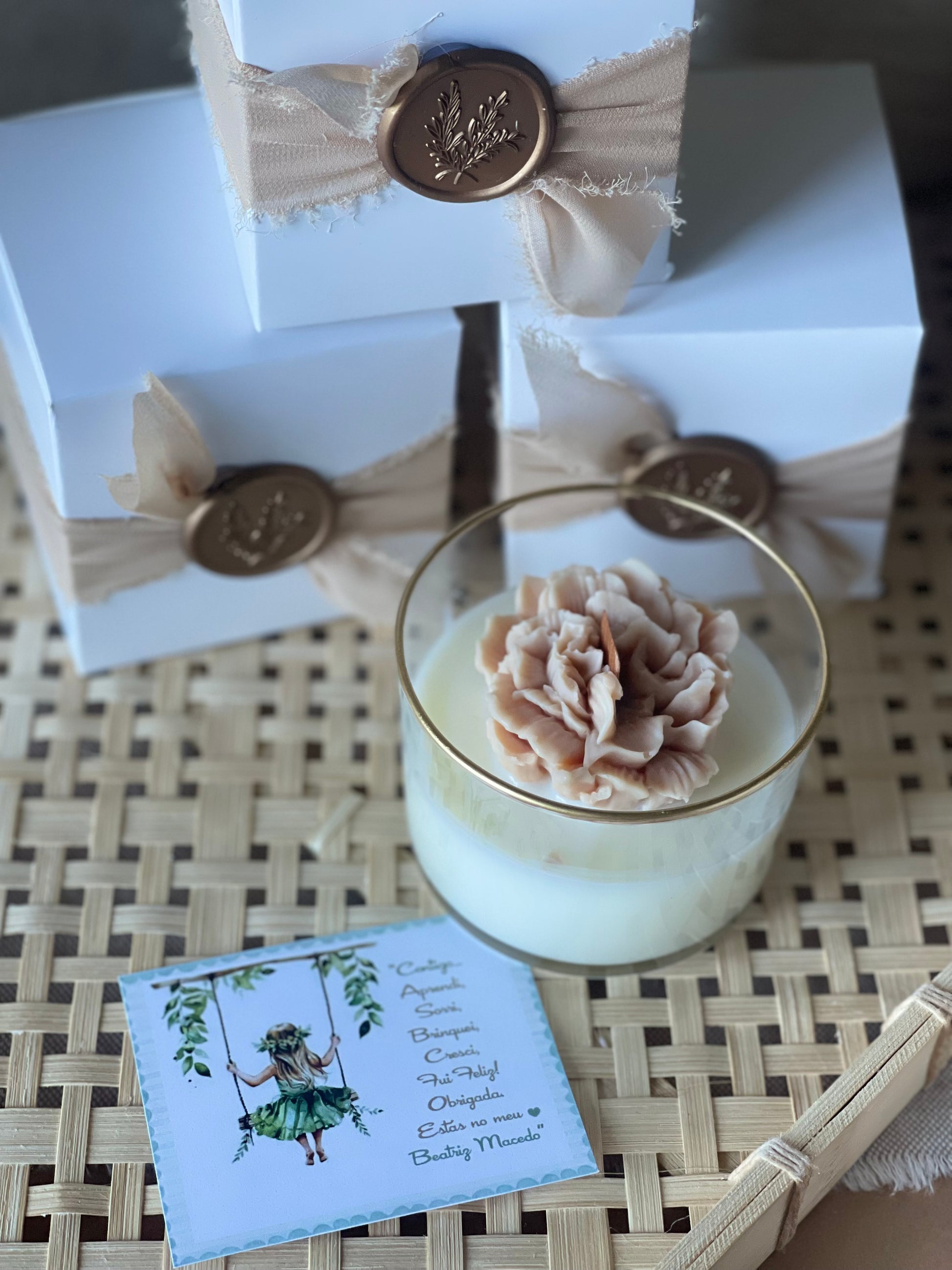 A vela é apresentada num vidro transparente. O topo da vela, possui uma flor da cor nude também de cera de soja. Para finalizar é colocada dentro de caixa de papel branca, finalizando com fita de chiffon nude e lacre dourado. Possibilidade de inserir cartão com mensagem no interior da caixa.