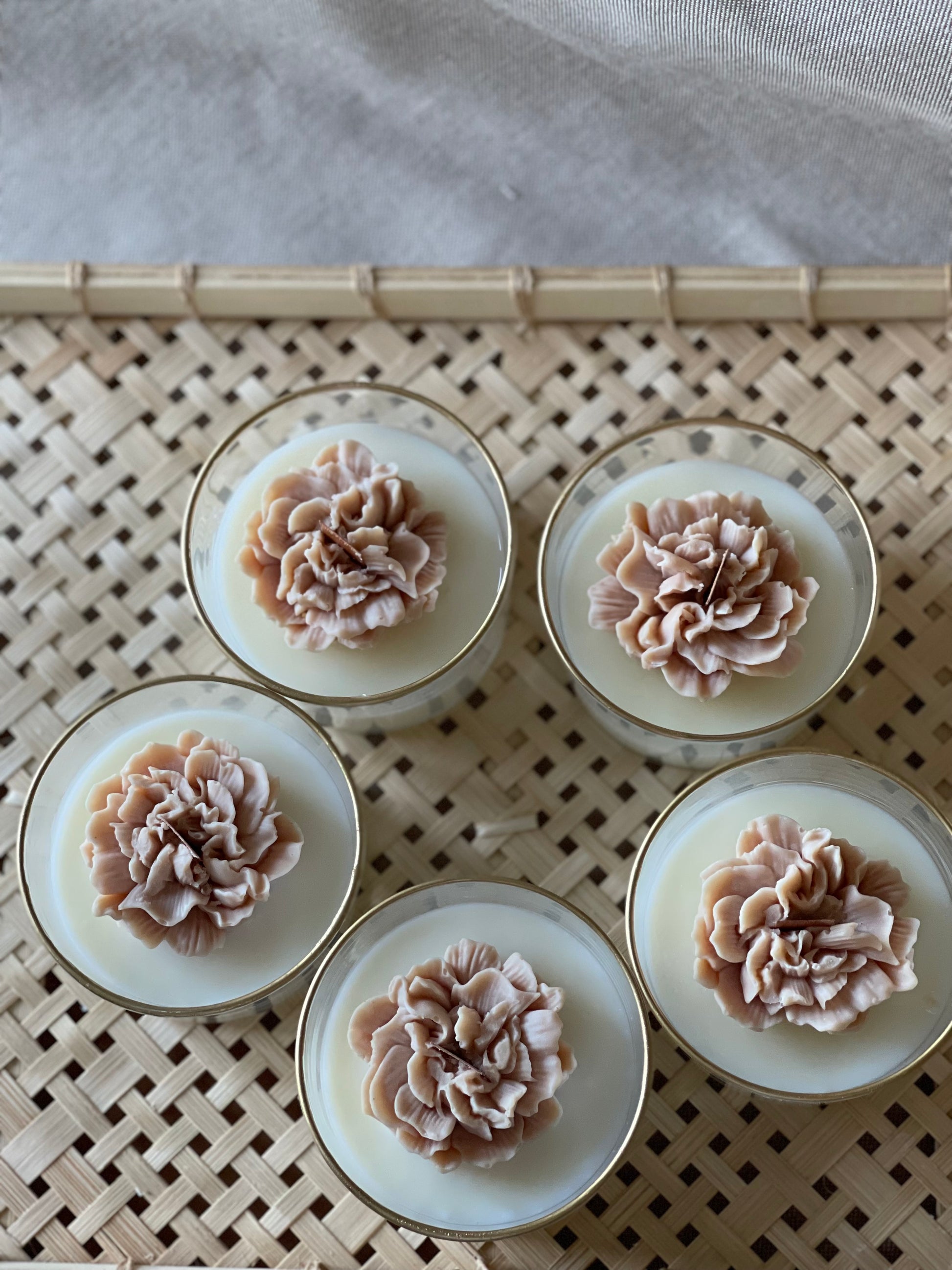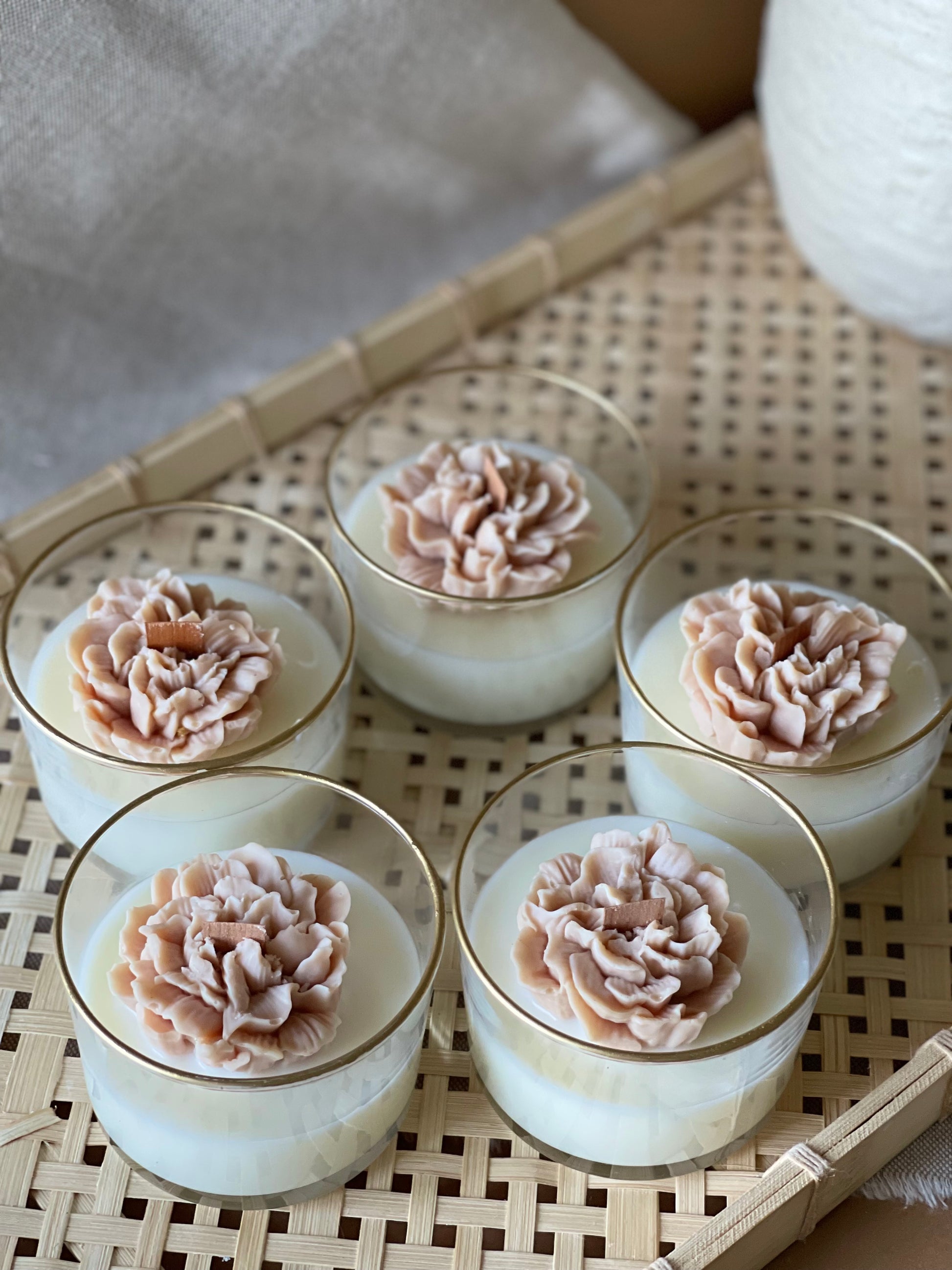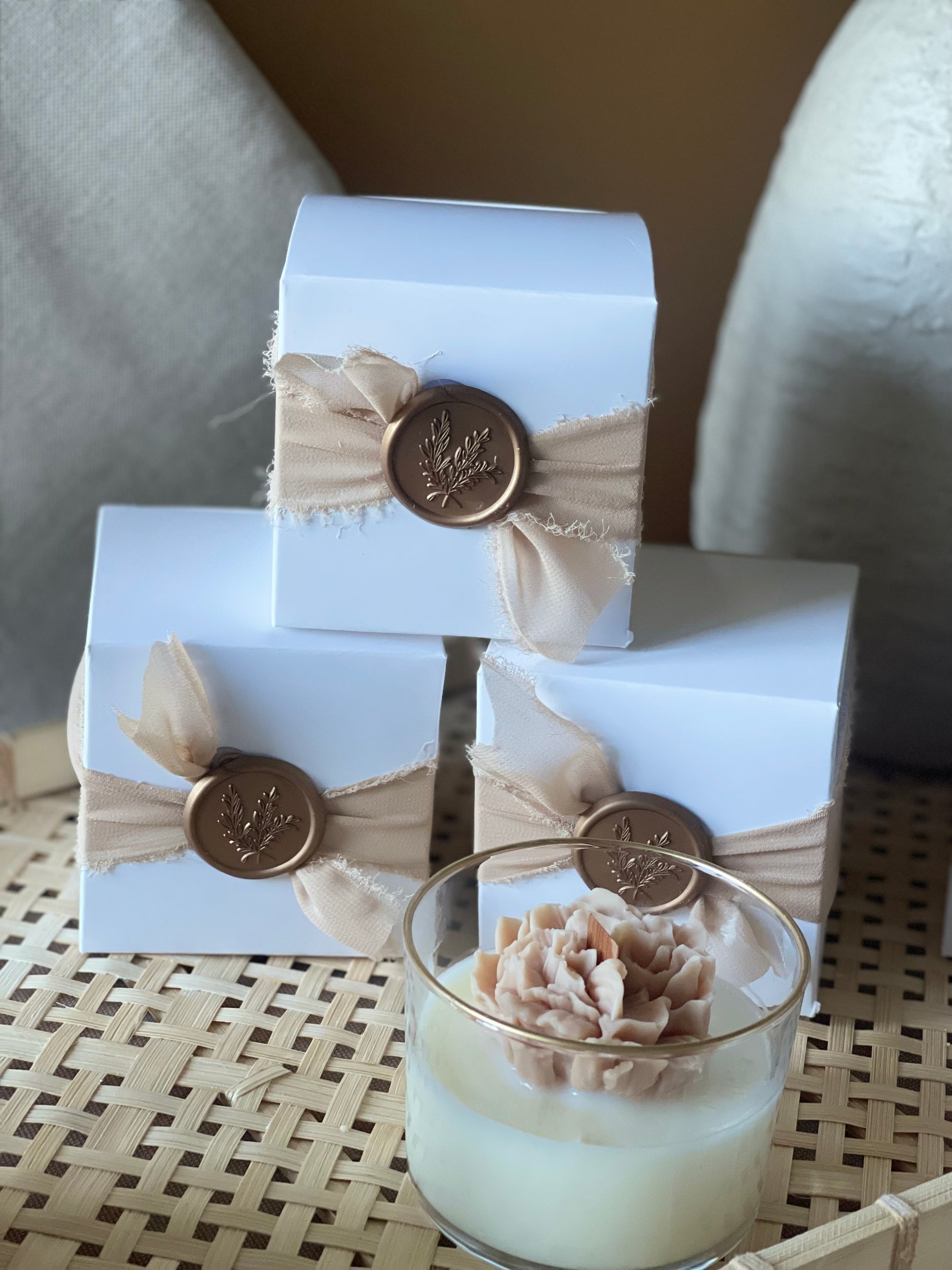 A vela é apresentada num vidro transparente. O topo da vela, possui uma flor da cor nude também de cera de soja. Para finalizar é colocada dentro de caixa de papel branca, finalizando com fita de chiffon nude e lacre dourado. Possibilidade de inserir cartão com mensagem no interior da caixa.